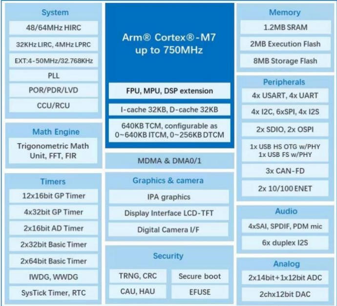 兆易创新正在重新定义这种边缘控制的基准。在复杂的机器人关节模组中,MCU不仅要负责电机的高频换相,还要实时处理编码器位置、扭矩反馈甚至温度保护。兆易创新的GD32H7系列微控制器,正是为此类高负载场景而生。该系列产品基于Arm Cortex-M7内核,主频高达750MHz,配备高速大容量内存架构及640KB可与CPU同频运行紧耦合内存(TCM),实现了高性能、低动态功耗与高速通信的有机统一。该系列MCU在外部存储与扩展连接方面展现出高度灵活性,配备2个OSPI接口支持高达200MHz时钟频率与双倍数据速率(DTR)模式,可高效直连PSRAM、HyperRAM、NAND Flash及NOR Flash等多种外部存储器,实现高速数据交换。