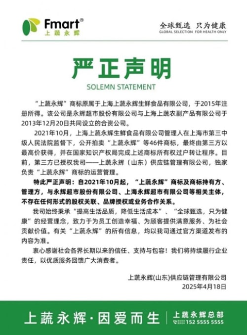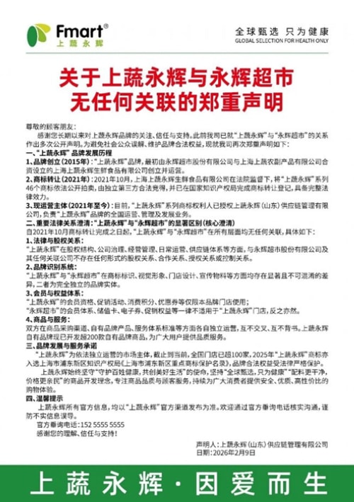 近日,上蔬永辉(山东)供应链管理有限公司再次发布郑重声明,明确自2021年10月商标转让完成后,“上蔬永辉”与“永辉超市”在所有层面均无任何关联。
