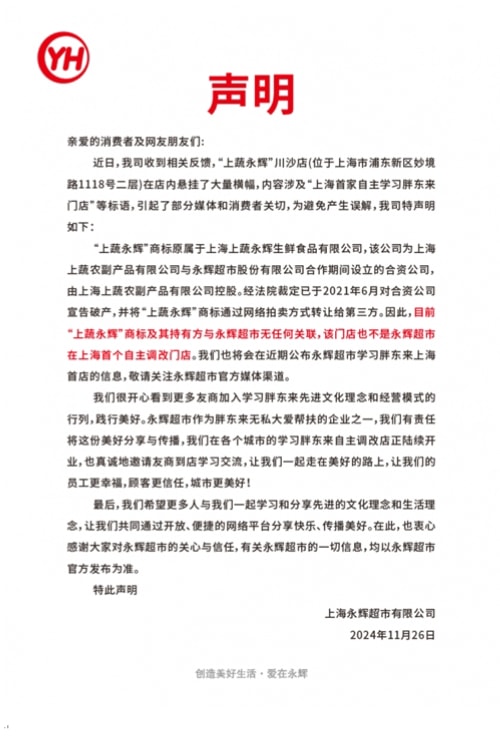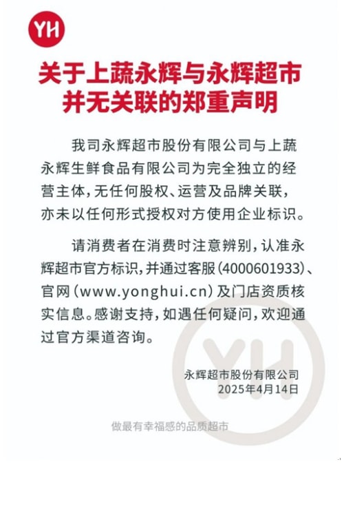 上蔬永辉再发郑重声明:与永辉超市无任何关联,品牌独立运营