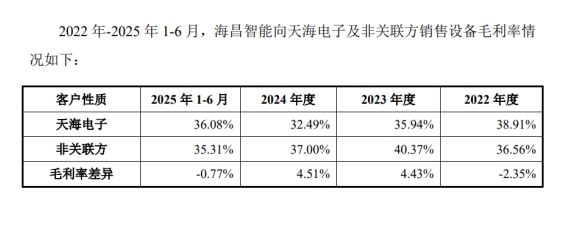 报告期各期,天海电子向海昌智能采购的主要设备及备件、模具及备件金额分别为:1.69亿元、1.57亿元、1.55亿元及1.04亿元,占向海昌智能采购金额的比例分别为85.33%、85.57%、86.25%及 81.59%。而海昌智能卖给天海电子的设备毛利率,与卖给其他非关联客户的毛利率,差异波动不定,时正时负。更微妙的是,在一些可比设备的采购价格对比中,天海电子从关联方采购的价格时而显著低于第三方,时而却又高于第三方。天海电子对此的解释多为“配置不同”、“定制化需求”。诚然,设备配置存在差异,但这种定价的波动与差异,是否给利润调节留下了过于灵活的操作空间?