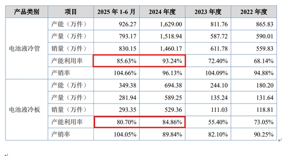 其次,从产能利用率来看,新富科技现有电池液冷管和液冷板的产能利用率已出现下滑趋势,截至2025年上半年,产能利用情况并不乐观。在这种情况下,新富科技仍计划通过募投项目大幅新增产能,是否存在固定资产闲置风险令人担忧。新富科技虽回应称现有产线已接近饱和,扩产项目主要用于服务头部客户的新增海外订单,募投项目预计将提升自动化水平和良率,并支撑未来三年订单增长。但这些说法缺乏足够的数据支持和市场依据,难以让人信服。