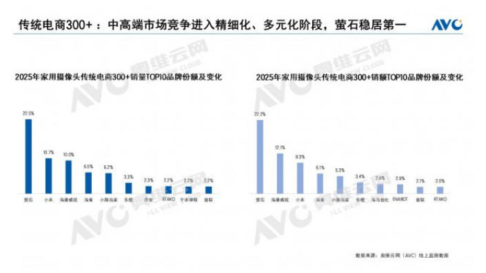 根据奥维云网(AVC)发布的《2025年中国家用监控摄像头行业发展报告》,萤石在300元以上中高端价位段市场表现卓越,其销量与销售额占比均超过22%,稳居行业第一,印证了其在高端市场的绝对领导地位。
