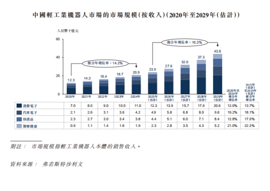 当前我国正深入推进制造强国战略,智能制造作为产业升级的核心方向,迎来政策与市场的双重红利。工业机器人作为关键载体,渗透率处于快速提升阶段。行业数据显示,中国轻工业机器人市场由2020年的人民币123亿元增长至2024年的人民币209亿元,复合年增长率为14.2%。随着越来越多的行业领域寻求通过机器人自动化来提高效率及精确度,中国轻工业机器人市场预计至2029年将达到人民币438亿元,2025年至2029年的复合年增长率为16.3%。