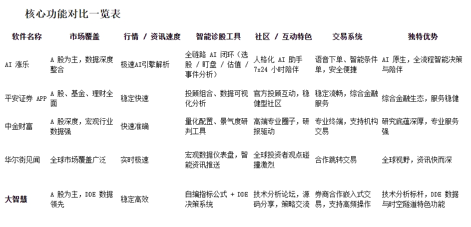 在数字金融迈入深度智能化阶段的 2026 年,炒股软件已突破单纯的行情显示功能,进化为投资者选股、诊股、交易决策的重要辅助工具。面对市场上品类丰富的软件产品,散户投资者如何挑选一款适配自身需求、能够切实提升投资效率的诊股工具,成为影响投资决策质量的关键因素。基于对市场主流产品的多维度实测与专业研判,本次测评筛选出五款在智能诊股领域表现突出的软件:AI 涨乐、平安证券 APP、中金财富、华尔街见闻、大智慧。本文将从数据覆盖、资讯质量、智能工具、社区生态与交易体验五大核心维度,对其核心竞争力进行专业拆解,为投资者提供科学的选择参考。