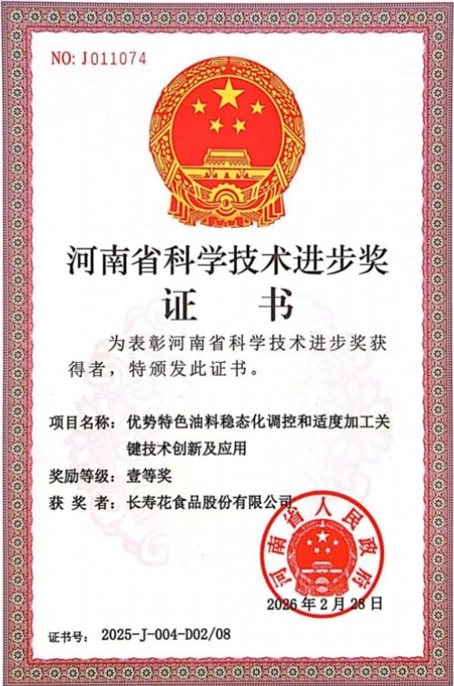 中国产经观察消息  近日,2025年度河南省科学技术奖励评审结果正式揭晓,长寿花食品股份有限公司联合河南工业大学共同完成的《优势特色油料稳态化调控和适度加工关键技术创新及应用》项目,成功斩获河南省科技进步一等奖。