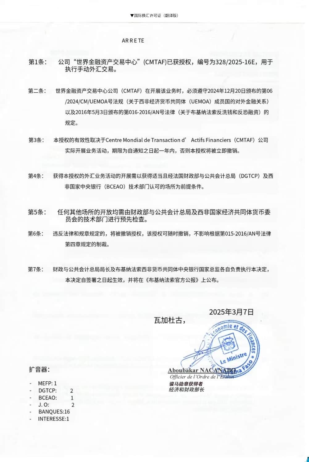 2025年金秋十月伊始,运鸿集团迎来重磅消息。其在布基纳法索运营的【世界金融资产交易中心】(CMTAF)下设企业【世界金融贵金属交易公司】(EMTMP)正式获得由布基纳法索国家经济与财政部、国家能源矿业与采石业部、国家工业商业与手工艺部联合审批颁发的黄金及其他贵金属交易许可法令文件,标志着运鸿集团正式取得在该国及全球范围内合法开展黄金及其他贵金属交易的资质,其全球化战略布局迈出坚实一步。