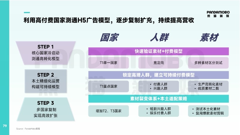 ● 详解从聚焦高转化的核心国家冷启动到构建可持续性的本土化运营,再到放眼全球扩张的跨国复制,3步测通H5广告模型,实现投放的合理扩张与营收的稳步提升……
