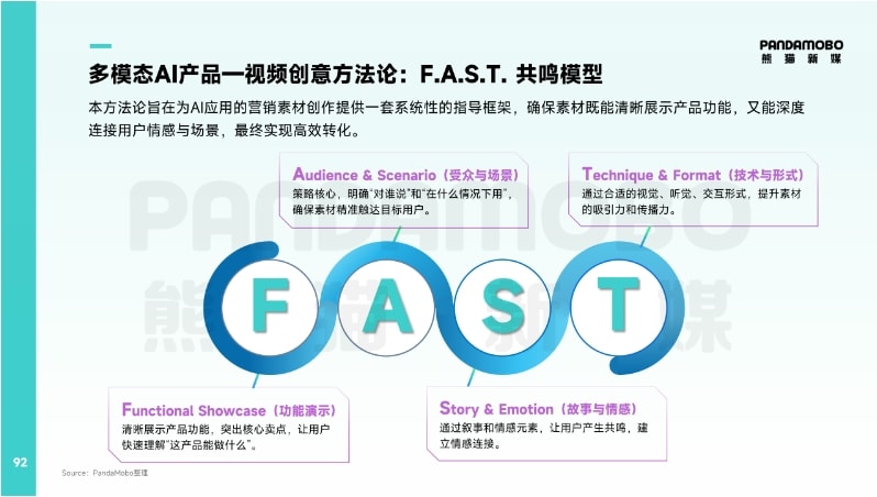 在这种背景下,行业已从“功能竞赛”转向“精准穿透”,谁能用更少预算击穿更深用户心智,谁就能存活。针对多模态AI产品的营销痛点,PandaMobo提出F.A.S.T.共鸣模型,通过: