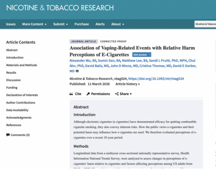 德克萨斯大学西南医学中心是美国首屈一指的学术医疗中心之一,该研究通讯作者、德克萨斯大学西南医学中心内科学教授大卫·格伯博士表示:“认为电子烟比传统卷烟更有害的错误观念,一方面会降低烟民通过电子烟戒烟的意愿,另一方面也可能促使目前的电子烟用户转向传统卷烟。因此,厘清这种认知转变的后果,对于制定戒烟策略至关重要。”