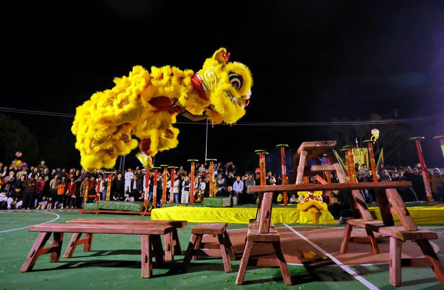 2026年3月11日,广东鹤山市鹤城镇坪山水心洞村热闹非凡,客家花炮庙会精彩开场,英歌舞、舞龙、舞狮等非遗项目轮番上演,吸引众多村民驻足观赏、拍照留念。黄继明摄(人民图片网)
