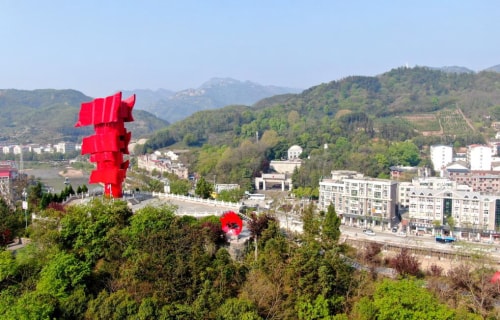 这是2021年4月9日拍摄的鄂豫皖苏区首府革命博物馆附近的英雄山上的“红旗飘飘”主题雕塑(无人机照片)。新华社发