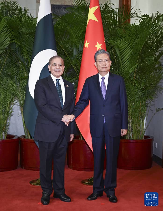 6月7日,全国人大常委会委员长赵乐际在北京会见巴基斯坦总理夏巴兹。 新华社记者 张领 摄